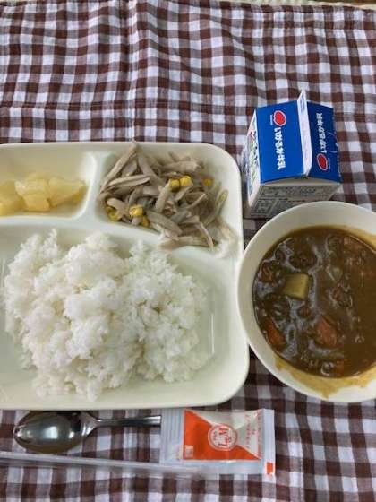 今日の献立は牛肉と金時豆のカレーライス、ごぼうサラダ、パインアップルの缶詰、牛乳です。