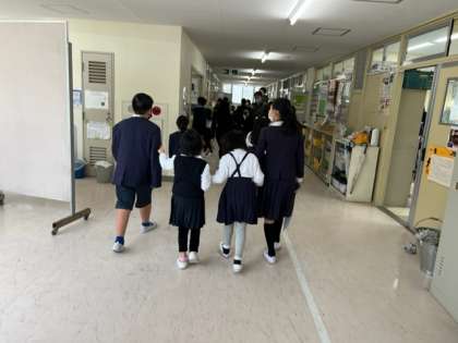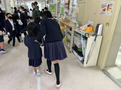 新今宮祭に向けて、今あるたてわり班を、たくさんのお店をまわれるように、さらに分けて話し合い活動を行います。6年生が1年生を迎えにきてくれました。