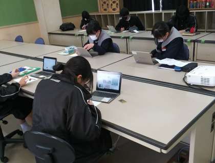 1月19日(木)、パソコン教室にて、8年2組の半分の生徒たちが各自のタブレットを利用して、キーホルダーのデザインを探したり、作ったりしていました。