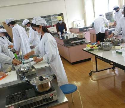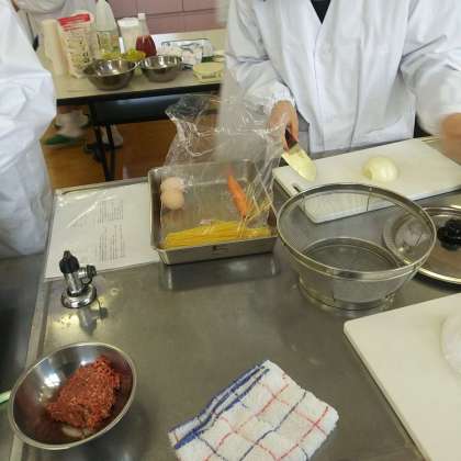 1月19日(木)、調理室にて、8年2組の半分の生徒たちが、ミートスパゲッティーとカップケーキを作っていました。