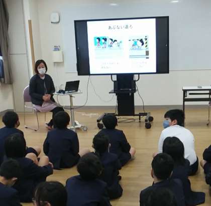 1月23日(月)、先週の発育測定の後、4年生・5年生に、保健室の先生から学校内外で注意してほしいことについてお話がありました