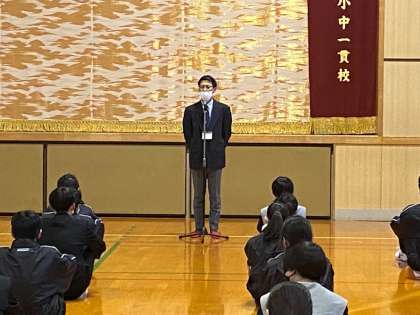 1月23日、体育館で中学校全校集会が行われました。9年生が学年末テストということもあって、78年生だけの集会となりました。少し寂しかったですね。
