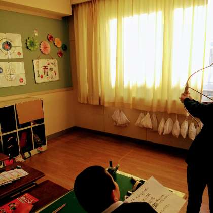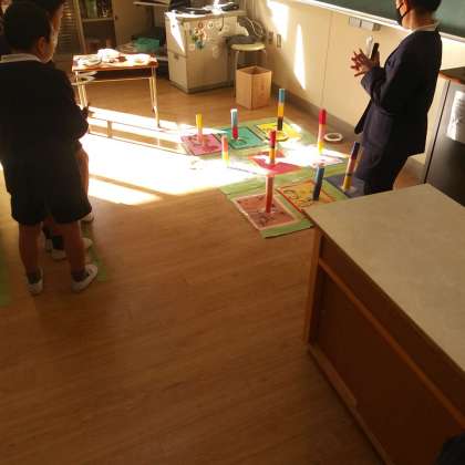 1月25日(水)、輪投げ、弓矢で的当て、リングにボールが入るかな。