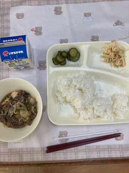 今日の献立は、ごはん、すき焼き煮、もやしとささみの炒め物、きゅうりのゆず風味、牛乳です。
