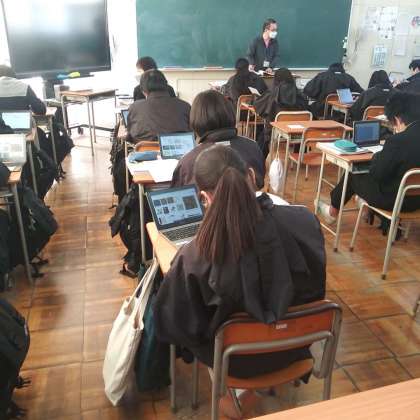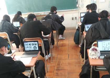 2月17日(金)、8年2組の教室で、和柄のデザインを各自のタブレットを使って、自分の柄を考え、着物のデザインとして描いていました。