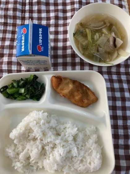 今日の献立は、ごはん、たらフライ、すまし汁、小松菜のごまあえ、牛乳です。