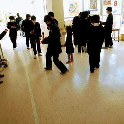 2月17日(金)、職員室前廊下で、児童たちの周りに、8年生の生徒たちが楽しくけん玉やこま回しに夢中になっていました。