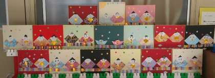 2月20日(月)、正面玄関ホール廊下に、32人のお雛様が飾られています。お雛様の中央の1対は、1年生の作品だそうです。顔の表情がどれもイキイキとして素晴らしいです。