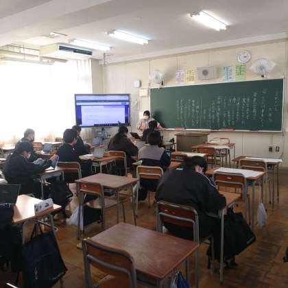 2月20日(月)、8年1組では、『走れメロス』を題材として、「勇者の定義は?」といった内容を生徒一人ひとりに考えて、意見を出してもらっていました。最後に、自分の意見をタブレットに打って先生に送信していました。