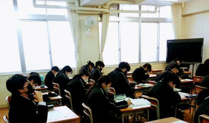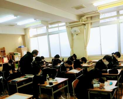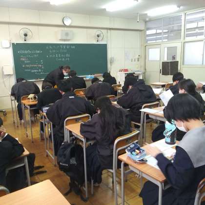2月21日(火)、16時〜17時、7年の習熟度別教室で、数学のプリント裏表1枚を仕上げた後は、先生に採点してもらったら、自学自習していました。