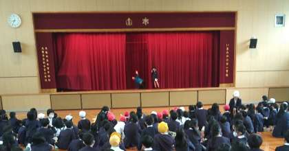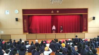 3月2日(木)、体育館にて、集会委員会の児童たちにより舞台上のカーテンの間を通過する物体はなんでしょう?というゲームをしていました。
