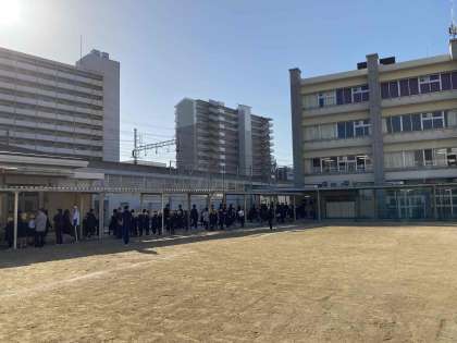 体育館から退場後、小学生が渡り廊下に並んで、9年生のために、