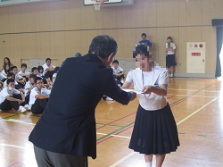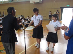 2学期始業式の後、部活動で優秀な成績を収めた生徒に、賞状の授与を行いました。写真は左から卓球部、バドミントン部、吹奏楽部です。