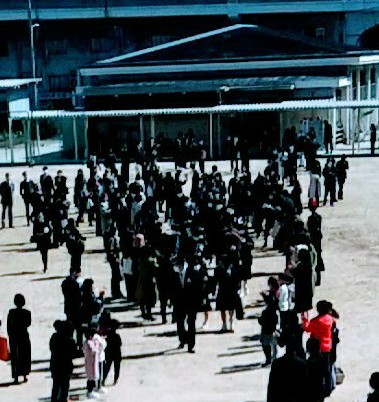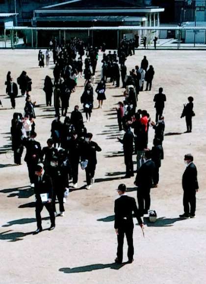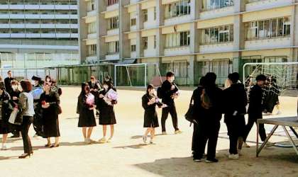 3月14日(火)、運動場にて、花道を通る1組・2組の卒業生たちと最後の記念撮影を楽しむ姿。