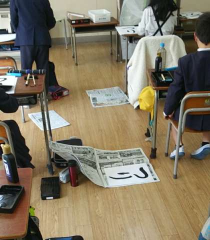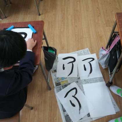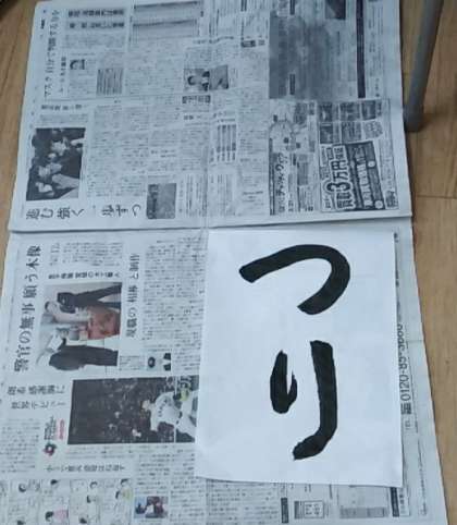 3月16日(木)、3年1組では、最初、見本を下に引いて『つり』という文字を練習して、1枚、2枚と下地なしで練習していました。