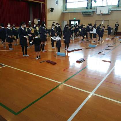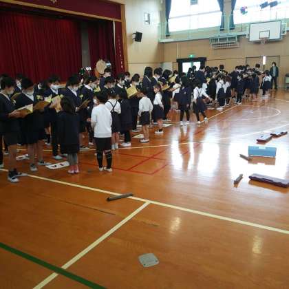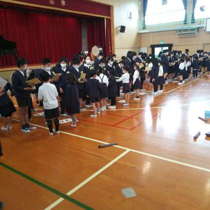 3月17日(金)、1年生たちから6年生たちへの贈り物が渡され、その後、6年生たちから1〜5年生たちへ贈り物が渡されました。