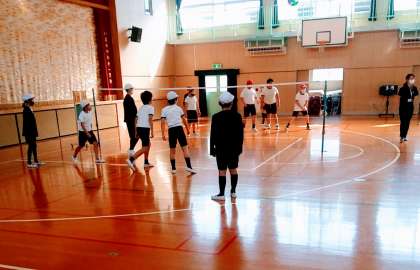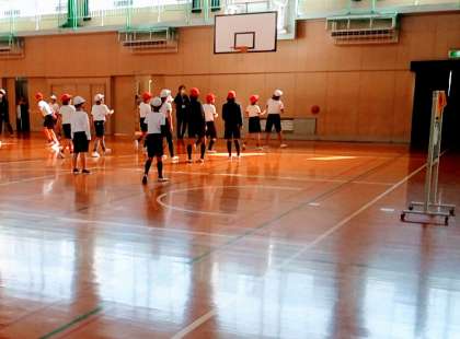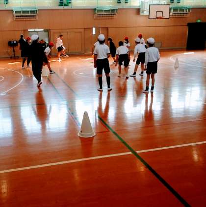 3月22日(水)、体育館にて、5年生が、舞台前で、バドミントンネットで、バレーを、真ん中のコートで、ドッヂボールを、玄関口で、バスケットをしていました。