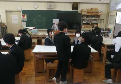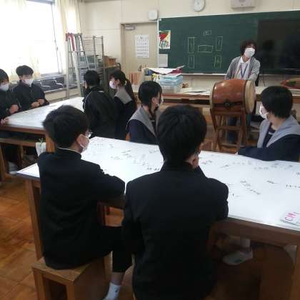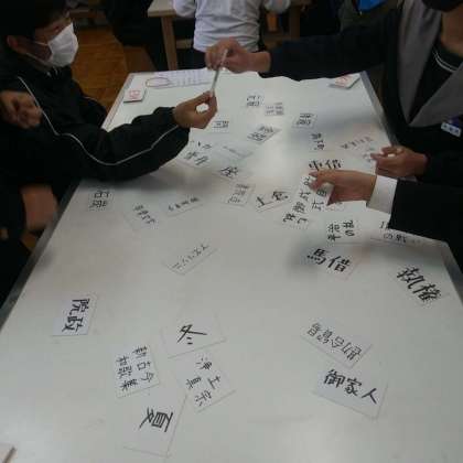 3月23日(木)、7年生は、美術室にて、各クラスで、社会のカルタ大会をやっていました。