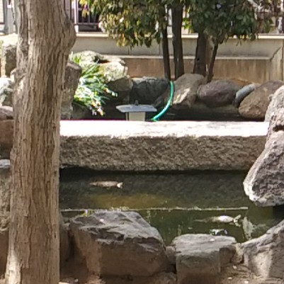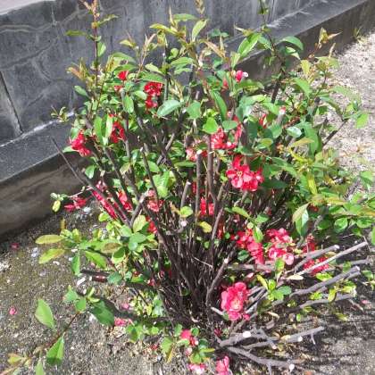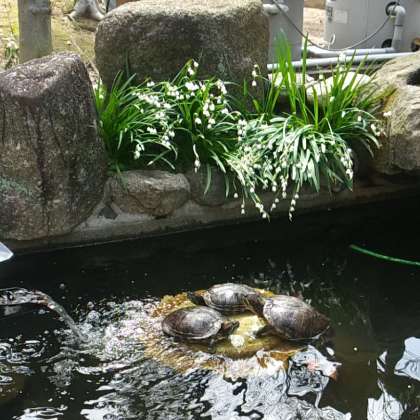 3月27日(月)、今宮の森内の池沿いにスズランが池の中央には、亀の甲羅干し。さらに、ボケの花が咲いていました。
