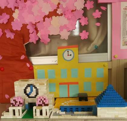 3月30日(木)、正面玄関入った廊下に、児童たちのサクラやレゴ作品が飾られています。