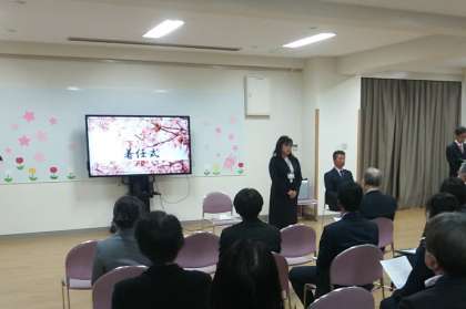 4月3日(月)、交流ホールにて、新副校長先生と小学校の新教頭先生の紹介が行われ、お二人からそれぞれご挨拶がありました。その後、15名の新転任の先生方の紹介がありました。