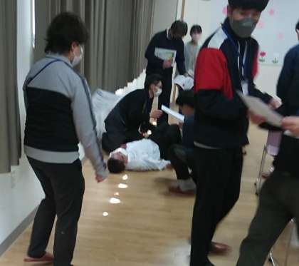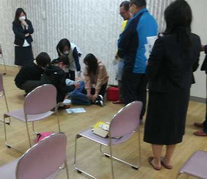 4月4日(火)、交流ホールで、『エピペン研修』と『救急時の対応』としてのアクションカードを活用し、対応のロールプレイを行いました。最後に、薬剤師の先生から、急な対応に備えて、この研修を振り返るようお話しいただきました。