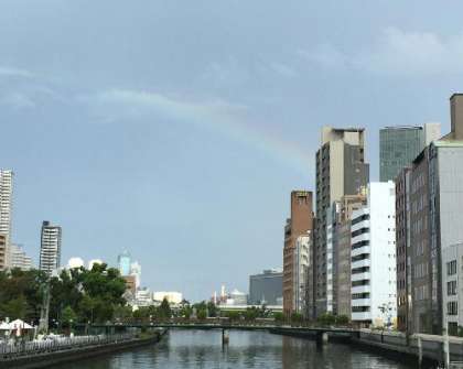 1日、淀屋橋の大阪市教育委員会に所用で出かけたとき、橋から薄い虹が見えたので、思わず写真に撮りました。