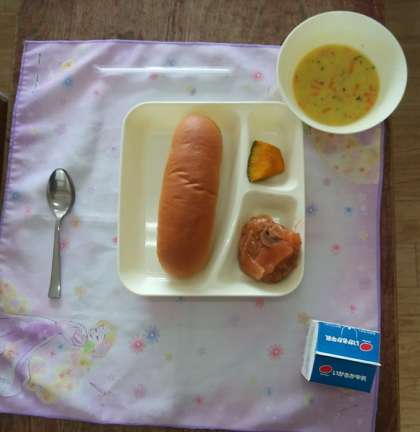 4月14日(金)、今日の献立は、黒糖パン、煮込みハンバーグ、コーンとキャベツのスープ、焼きカボチャ、牛乳です。給食は、成長期に必要な栄養素をバランスよくとれように考えられた食事です。