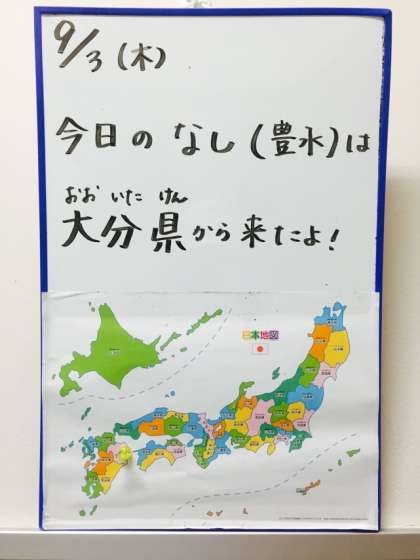 毎日、雨が降ったりやんだりしていますが、少しずつ秋の気配を感じるようになりました。給食にも秋の果物として「なし」が登場しました。