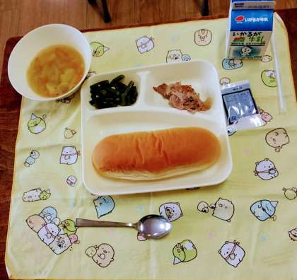 4月19日(水)、今日の献立は、コッペパン、ブルーベリージャム、豚肉のガーリック焼き、スープ、三度豆とコーンのサラダ、牛乳です。給食は、6つの食品群を組み合わせ、栄養のバランスを考えて作られています。今日もおいしくいただきました。