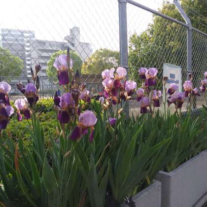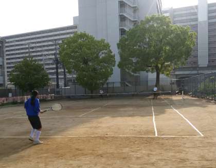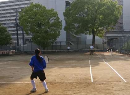 4月21日(金)、あやめが咲き誇る花園公園で、ソフトテニス部の生徒たちが、明日の春季総体ブロック予選に向けての練習をしていました。