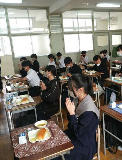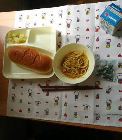 4月24日(月)、今日の献立は、おさつパン、カレースープスパゲッティ、キャベツのピクルス、ミニフィッシュ、牛乳です。『春キャベツ』は、葉が柔らかく、甘みがあるもの。『冬キャベツ』は、葉がしっかりしているため、煮くずれが少なく、加熱調理に適しています。