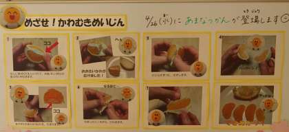 皆さんは、給食室前掲示板の『めざせ!かわむきめいじん』というタイトルに気づいていましたか?明日の給食に出ます。挑戦してくださいね!!
