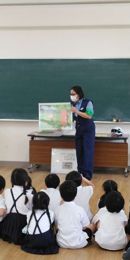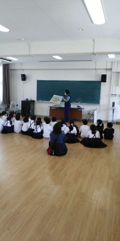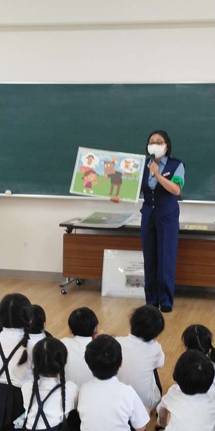 三時間目、一年生は区役所の方を招いて、防犯教室を行いました。職員の方から「一人で歩かない」「知らない人についていかない」などの説明を聞かせていただきました。子どもたちは真剣な表情で聞くことができました。