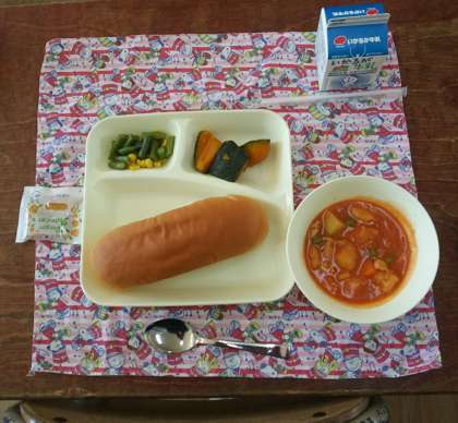 5月1日(月)、今日の献立は、コッペパン、アプリコットジャム、ケチャップ煮、さんどまめとコーンのソテー、焼きかぼちゃの甘みつかけ、牛乳です。