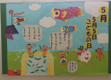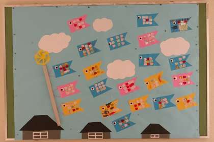 新館の玄関に、すまいる児童たちの作品が飾られています。また、職員室前の階段2階から3階にかけての踊り場にも素晴らしい作品があります。
