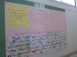 56年生の掲示板です。組体操の練習が終わるたびに、「今日のめあて」が貼られていきます。