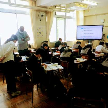 5月11日(木)、7年1組では、C-NETの先生の発音をよく聞き、プリントで、英単語を書く練習をしていました。「大文字や小文字、ピリオドに気をつけて」というアドバイスを聞いて、生徒たちは丁寧に書いていました。