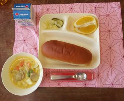 昨日、5月11日(木)の献立は黒糖パン、コーンクリームシチュー、キャベツときゅうりのサラダ、かわちばんかん、牛乳でした。「かわちばんかん」は、グレープフルーツに似て、苦みが少なく、さわやかな甘みがあります。
