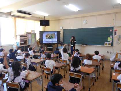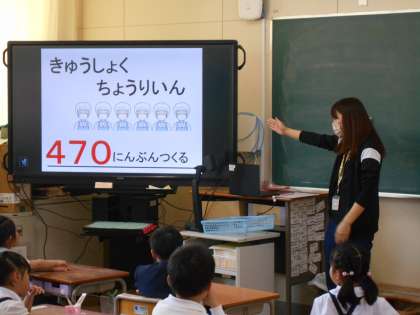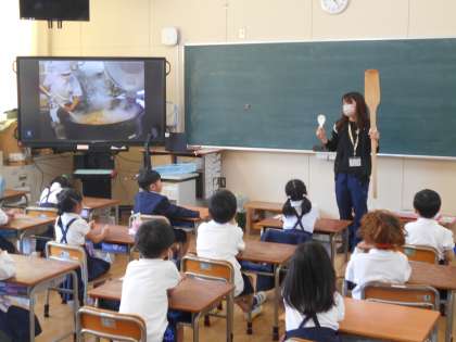 5時間目、1年生は栄養教諭による給食についての学習に取り組みました。毎日食べている給食が出来上がるまでの過程を学習することができました。一日約500人分の給食をつくることや、調理で使うおおきなしゃもじやお玉にびっくりしていました。