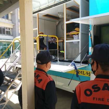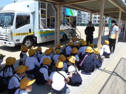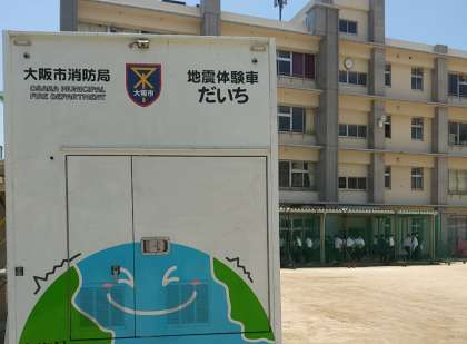 校内では、児童生徒が、たくさんの体験活動をします。写真は、地震体験ができる車です。