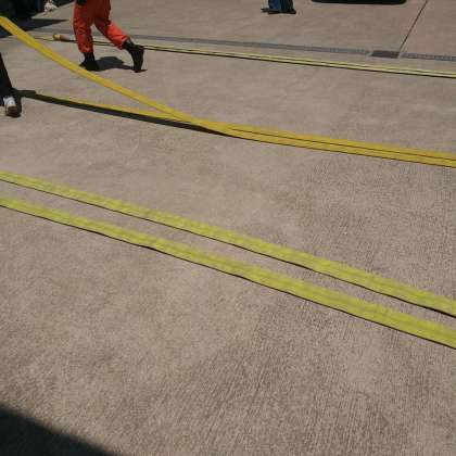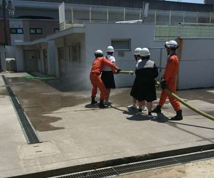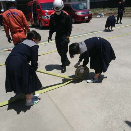 体育館前では、実際に消防で使われているホースをたたむ訓練をしました。また、プール横では、プールの水を利用してホースの勢いに負けないようにしっかりとホースをつかんで放水をする体験をしました。
