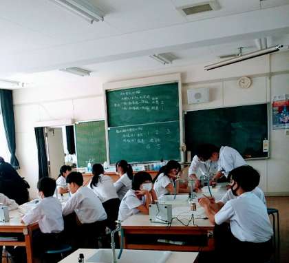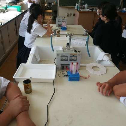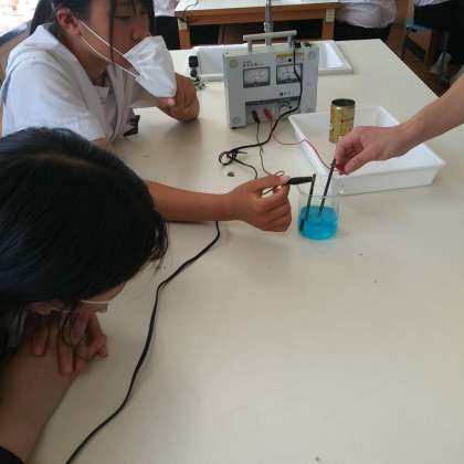 5月17日(水)、8年生は、理科室にて、塩化銅水溶液(青色の水溶液)の電気分解や水酸化ナトリウム水溶液(ピンク色の水溶液)の電気分解の学習をしていました。