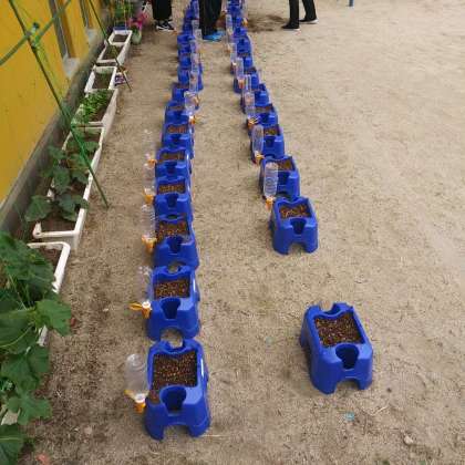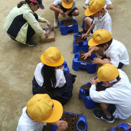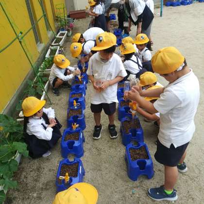 中庭で、各自のプランター土を入れてもらい、担任の先生から種や肥料を受けとり、プランターにまきました。そのあと、ペットボトルでたっぷり水やり。
