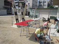 暑い中、管理作業員さんも運動会の準備をしています。写真は入退場門を作っているようすです。大阪市立新今宮小学校第1回運動会にふさわしい立派な門が、もうすぐ完成します。