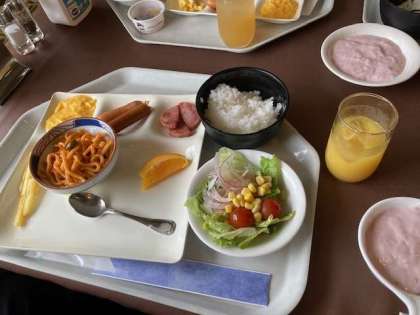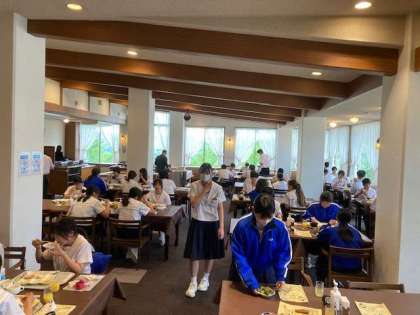 バイキング形式の朝食です。和洋とり混ぜたメニューで、生徒も大喜びです。