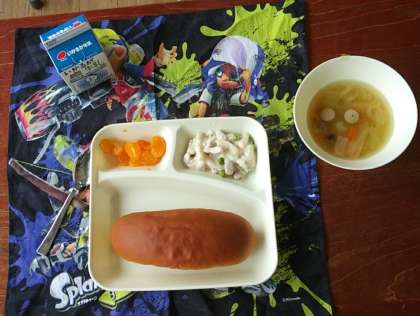 5月29日(月)、今日の献立は、黒糖パン、マカロニグラタン、キャベツのスープ、みかんの缶詰、牛乳です。大阪市の給食のパンは、小麦粉と砂糖、ショートニング、脱脂粉乳、イースト、食塩、水を混ぜ合わせて作ります。