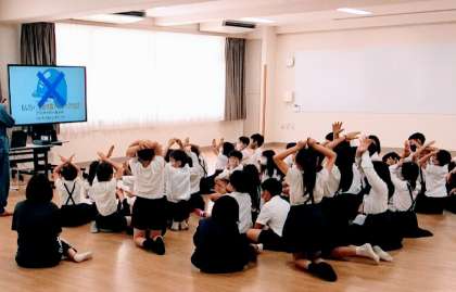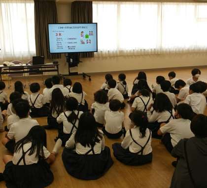 6月1日(木)、2時間目、4年生児童たちは、交流ホールにて、ゴミ分別のお話を聞きました。また、「まる・ばつ」クイズで、大いに盛り上がっていました。3時間目は、体育館前で、パッカー車にゴミを入れる体験をします。