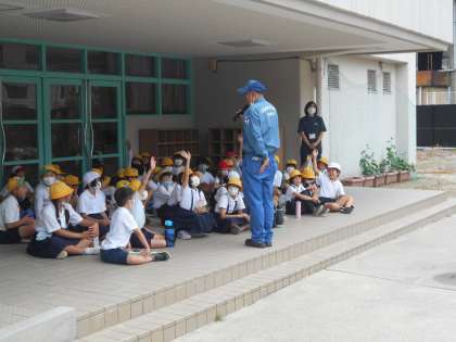 3時間目、実際にパッカー車にゴミを入れる体験をしました。スイッチを押して機械を動かし、緊急停止ボタンを押して止めることもできました。子どもたちは間近で見るパッカー車の迫力に驚いていました。また、パッカー車から流れる音楽には収集するものによって違いがあることを知りました。