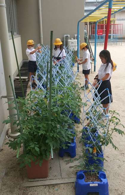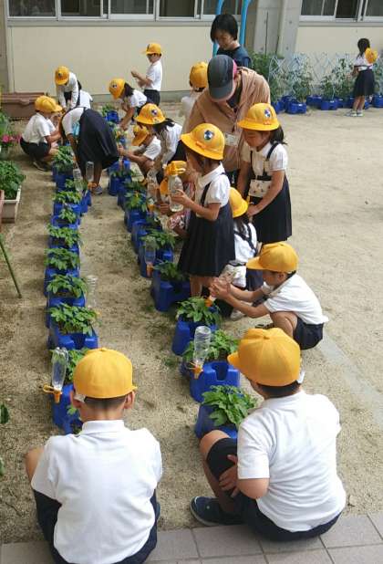6月5日(月)、中庭にて、1年生と2年生の児童たちが、朝の水やりをしていました。朝顔はきれいに、ミニトマトはおいしく育ちますように。